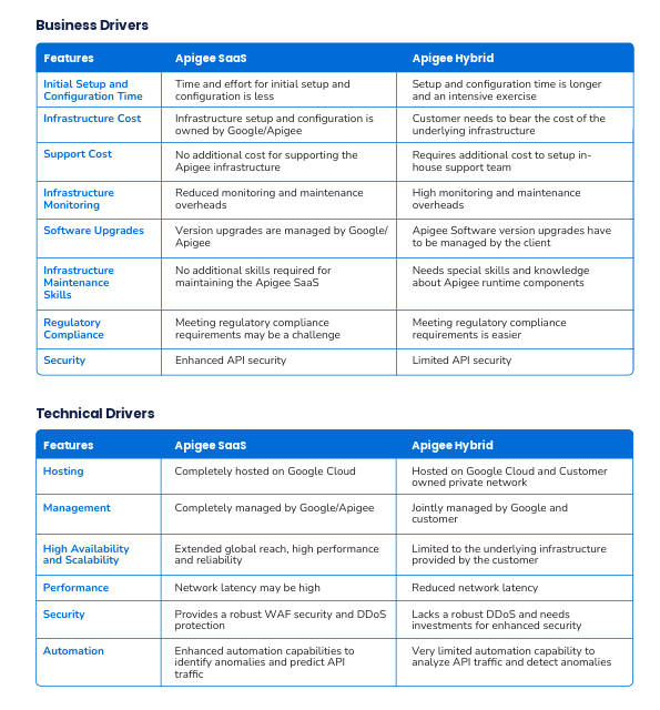 Having this basic architectural understanding, let's look at the main business and technical drivers driving the selection between SaaS and Hybrid offering of Apigee.